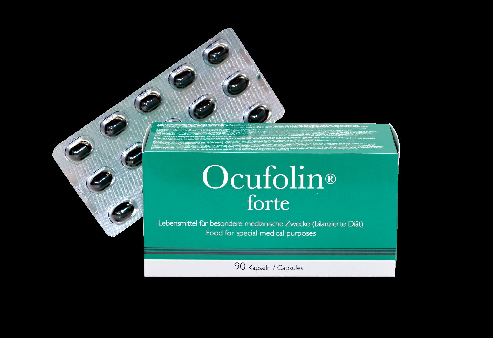 Mit **Ocufolin®** forte werden gezielt jene Nährstoffe zugeführt, die bei Augenleiden wie der AMD (Altersbedingte Makuladegeneration) und der DR (Diabetische Retinopathie) unzureichend aufgenommen werden. Dieses Lebensmittel für besondere medizinische Zwecke unterstützt die Aufrechterhaltung der Nährstoffversorgung und deckt den krankheitsbedingt erhöhten Bedarf an Mikronährstoffen.