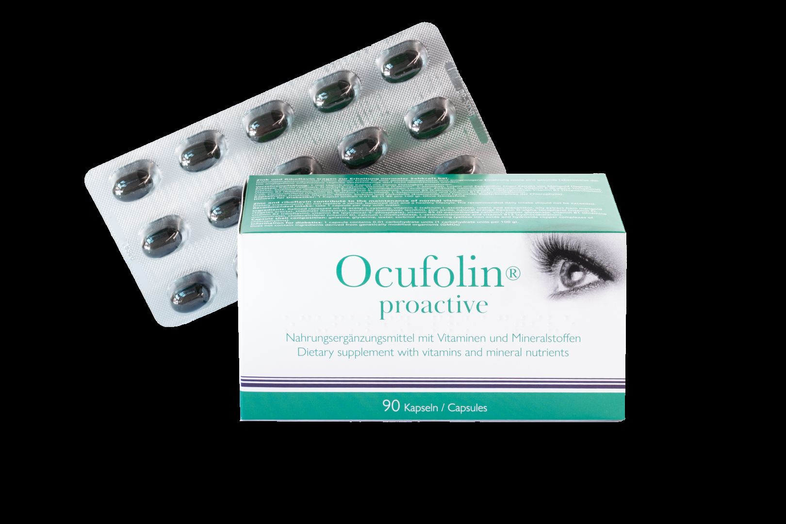 Inhaltsstoffe Ocufolin® proactive: Durchschnittliche Nährwertangaben/ pro Kapsel/ pro 100 g Brennwert 19.3 kJ / 4.7 kcal 2359 kJ / 568 kcal Fett 344 mg / 42 g Gesättigte Fettsäuren 52.5 mg / 6.4 g Kohlehydrate 172 mg / 21 g davon Zucker 21.3 mg / 2.6 g Eiweiss 213 mg / 26 g Salz 0.7 mg / 0.09 g |
