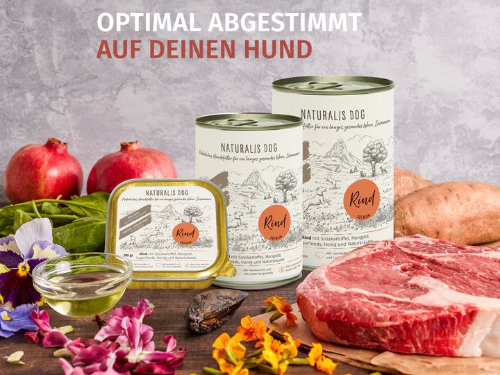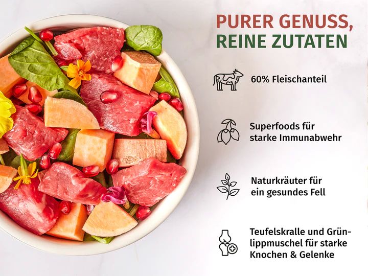 Natürliches Monoprotein-Nassfutter mit 60 % Rindfleisch, verfeinert mit Süßkartoffel, Mangold, Superfoods und Kräutern. Getreidefrei, ohne künstliche Zusätze – ideal für sensible Hunde und eine artgerechte, nährstoffreiche Ernährung.